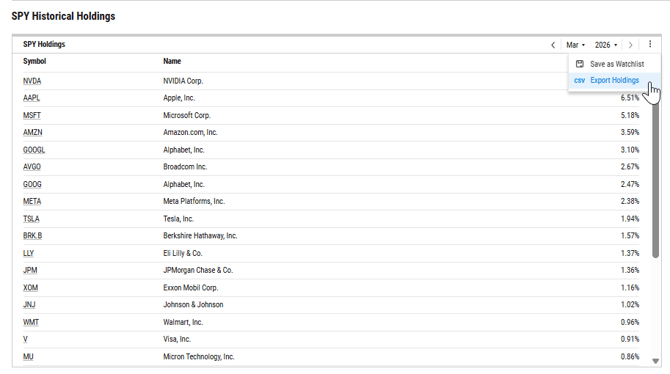 Historical holdings can be exported to Excel or saved as a watchlist by selecting the three dots in the upper right corner of each holdings module.