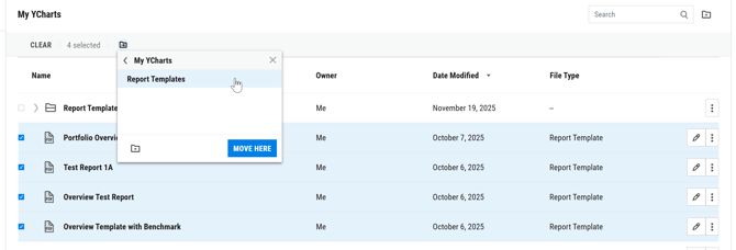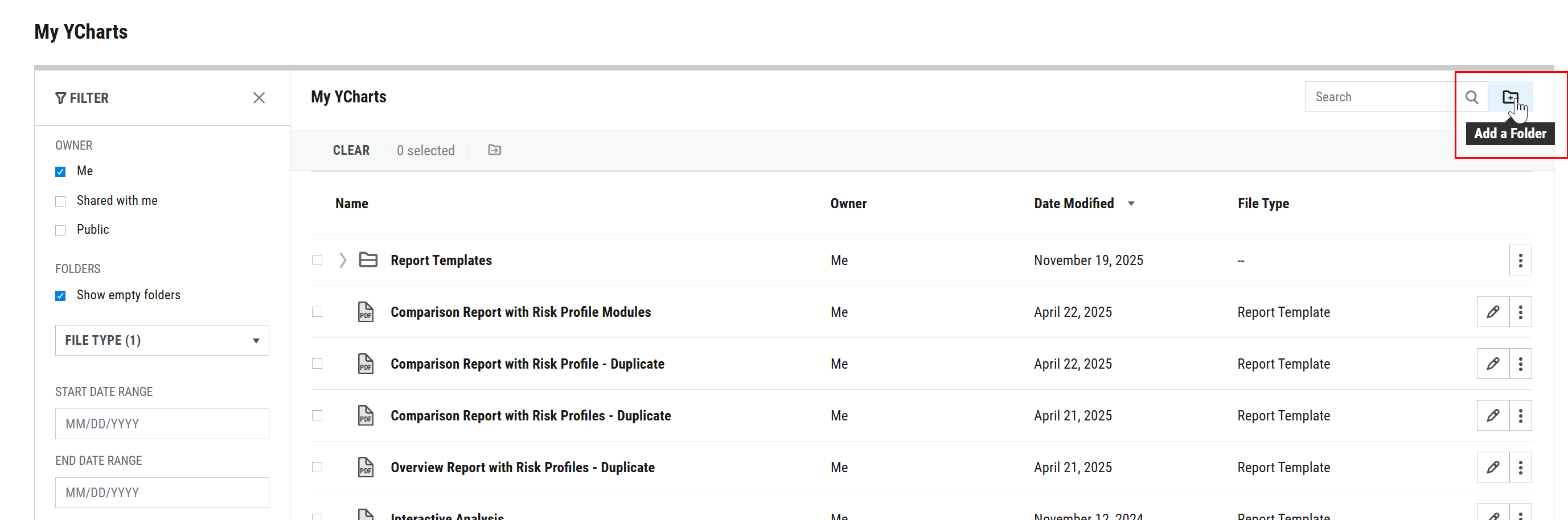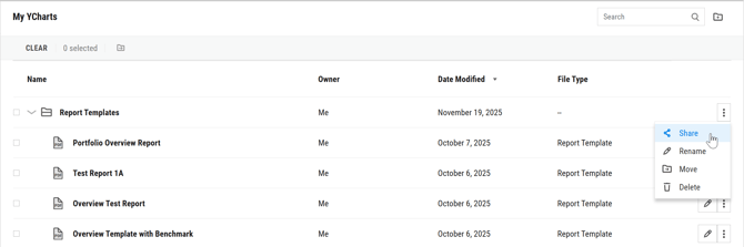 The easiest way to bulk share saved assets like portfolios, reports, charts, etc. is by creating a folder within My YCharts and adding and then sharing with your preferred share group. To do this, follow these steps: